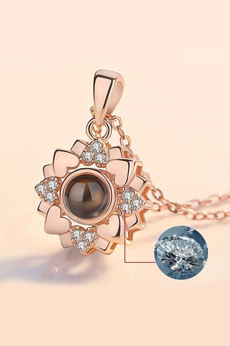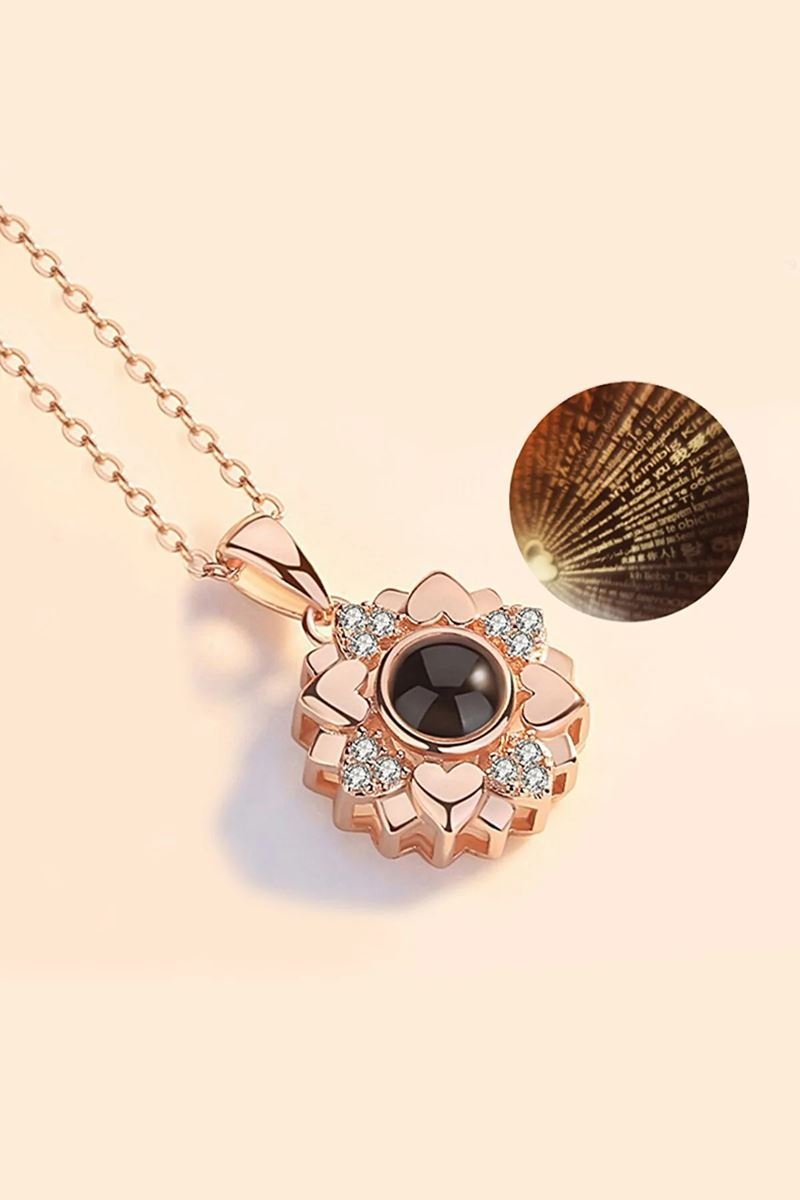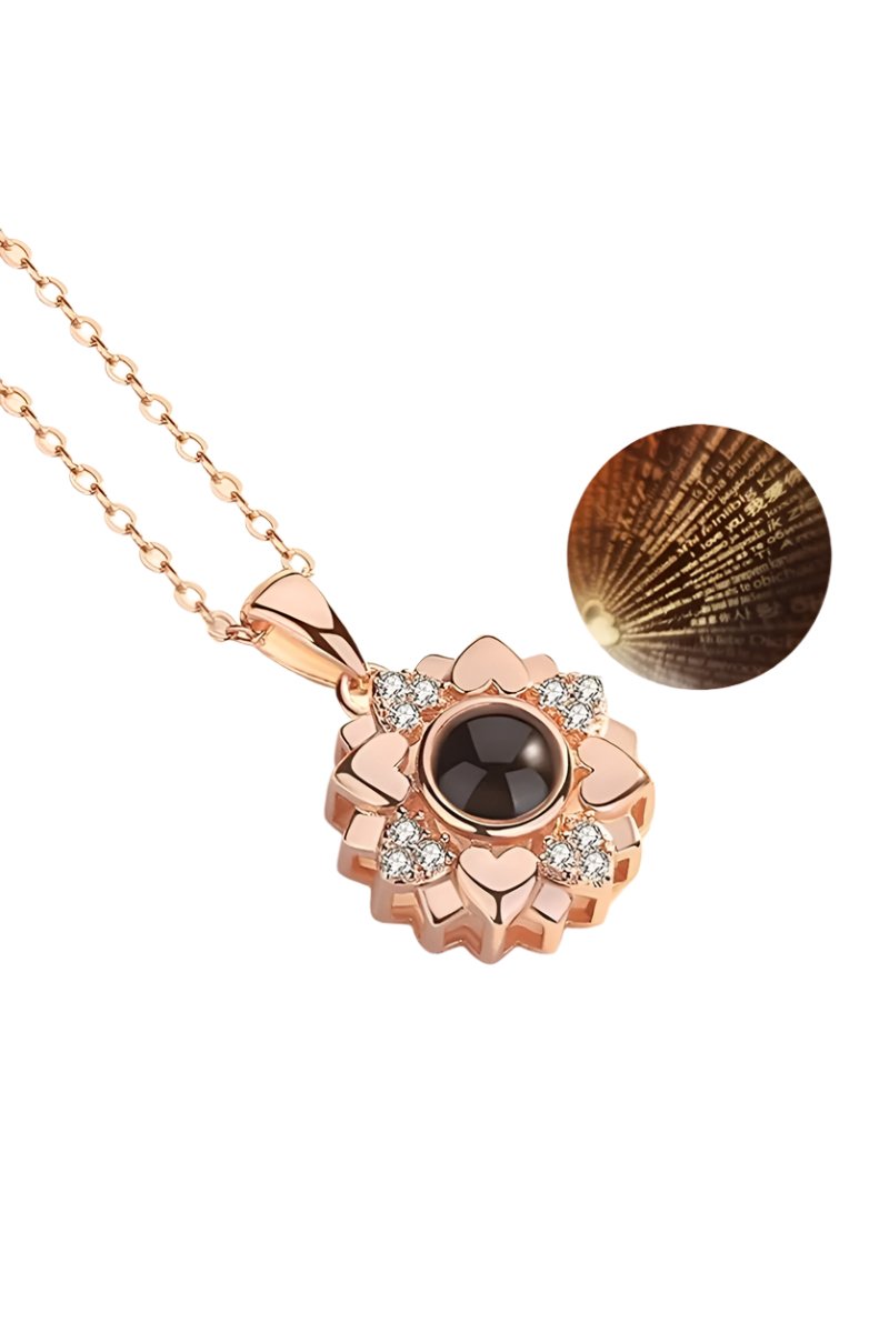 This captivating necklace is more than just an ornament; it's a symbol of your love expressed in a hundred different ways. The stunning pendant features a unique stone that, when held close and illuminated by your phone's flash, projects a hidden message: "I love you" in 100 languages.