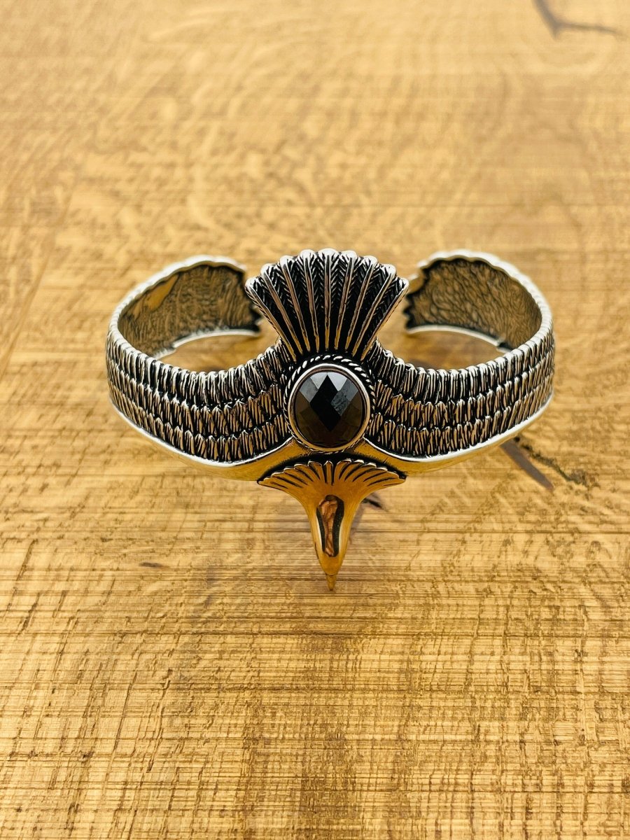 Hæv din stil med dette fantastiske justerbare sølvarmbånd til mænd med ørn. Håndlavet med præcision, har dette cuff-armbånd et indviklet dyremotiv og en slående sort zirkonsten, hvilket gør det til et bemærkelsesværdigt smykke.