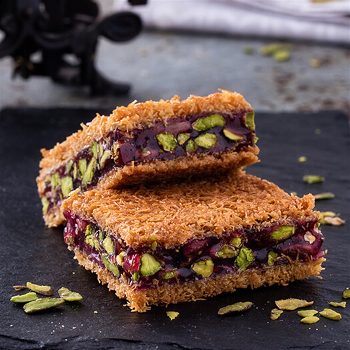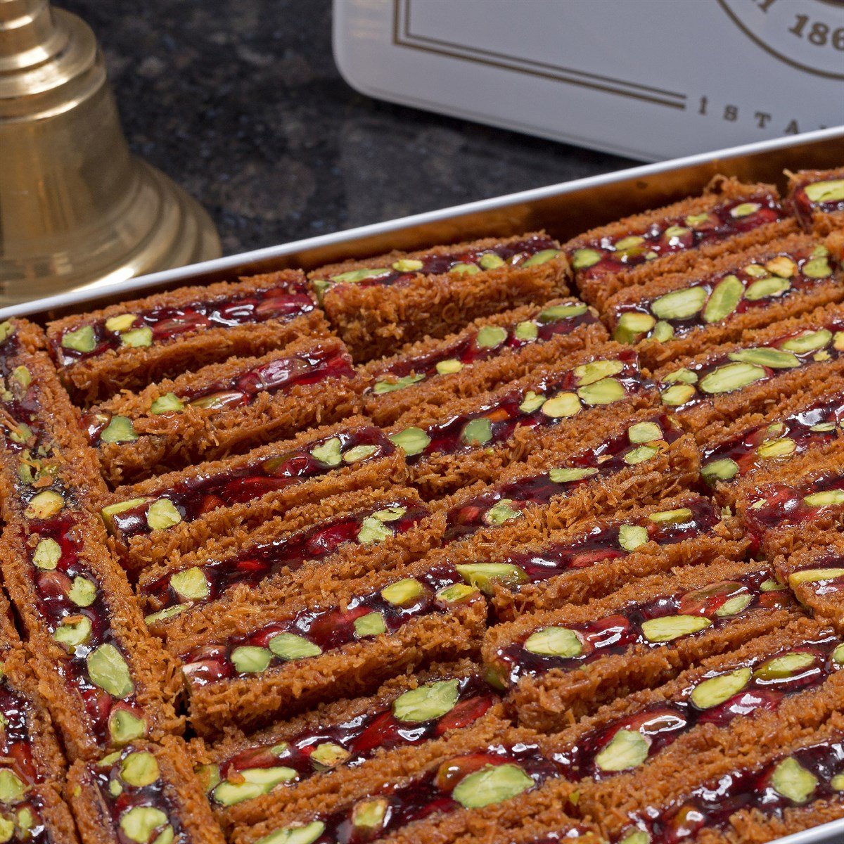 Den osmanniske Kadayif med granatæble kombinerer en klassisk granatæble tyrkisk delikatesse med pistacienødder, der er sandwichet mellem to lag af kadayif, lavet af revet dej. Sammen bringer de de vidunderlige smage af tyrkisk delikatesse og kadayif ind i én lækker pakke.