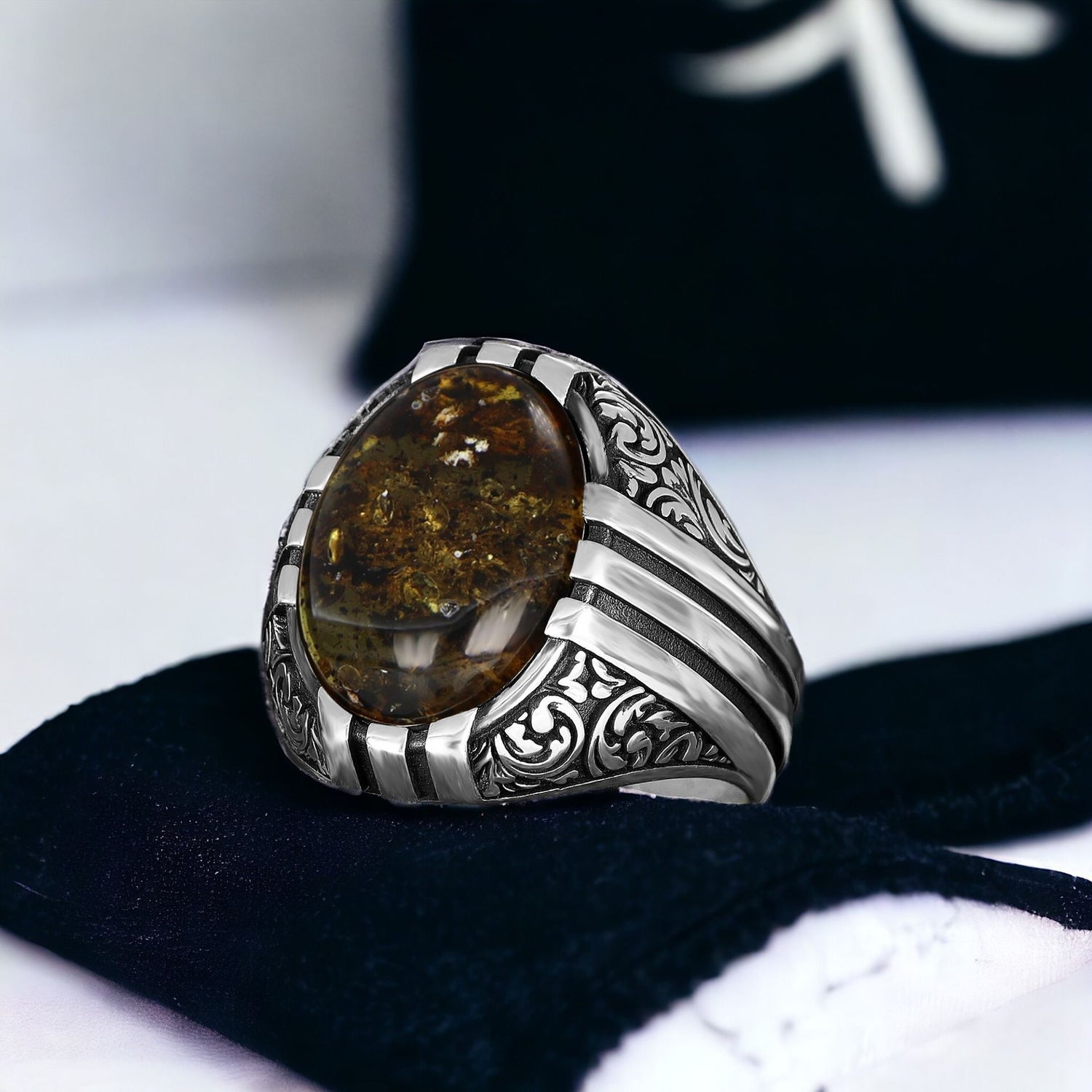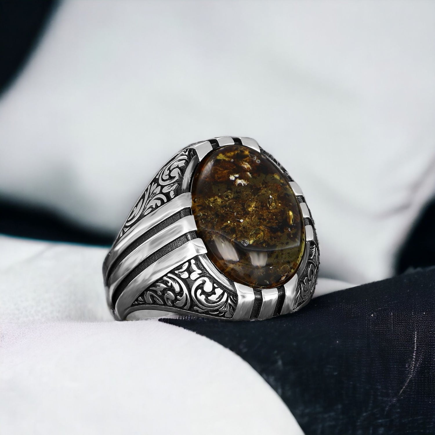 Elegance Møder Tradition med Herresølvring med Fossil Drop Amber Sten