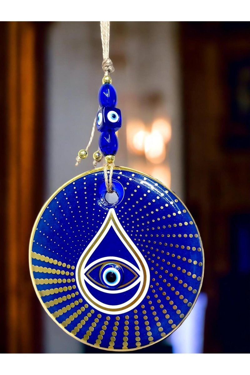 Unfurl a captivating tapestry of vibrant energy and cultural protection with the Golden Polka Dot Blue Glass Beaded Wall Ornament. This exquisite piece combines shimmering beads, mesmerizing glass drops, and playful golden accents to create a unique and joyful addition to your home decor.
