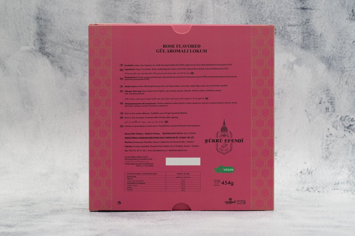 Experience Sukru Efendi's premium Turkish delight encased in a sleek square box filled with the delicate essence of rose. Crafted to cater to the preferences of the new generation, this vegan-friendly treat from the "Open and Enjoy" range offers a delightful blend of tradition and modernity.